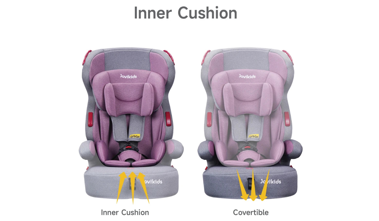 The car seat modes let you switch between Inner Cushion for infants and Convertible for older kids, ensuring safety and comfort with a secure, adjustable design.